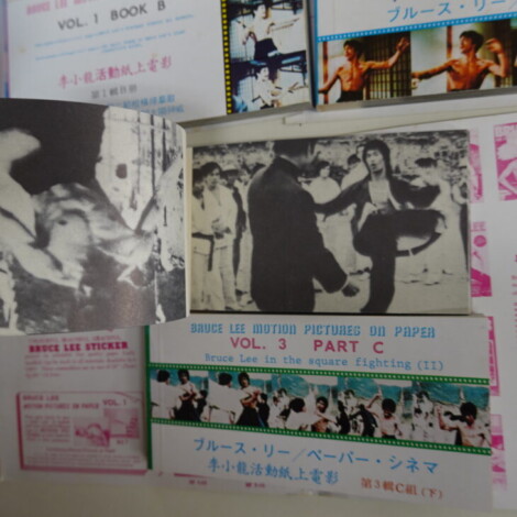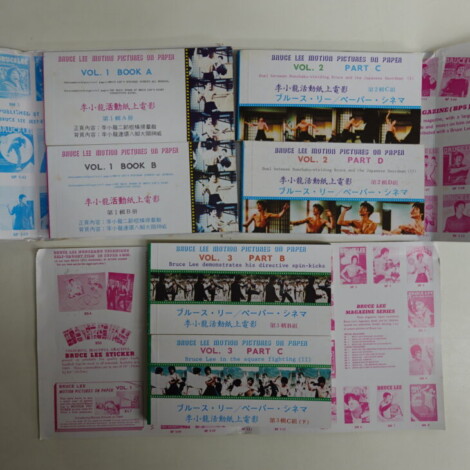 当時は世界中でブルース・リー人気が爆発し、映画パンフレット、ポスター、カード、雑誌、玩具など様々な関連グッズが発売されました。今回の 「Motion Pictures on Paper」 もその一つで、映画のアクションシーンを紙の上で再現するというユニークな企画商品です。